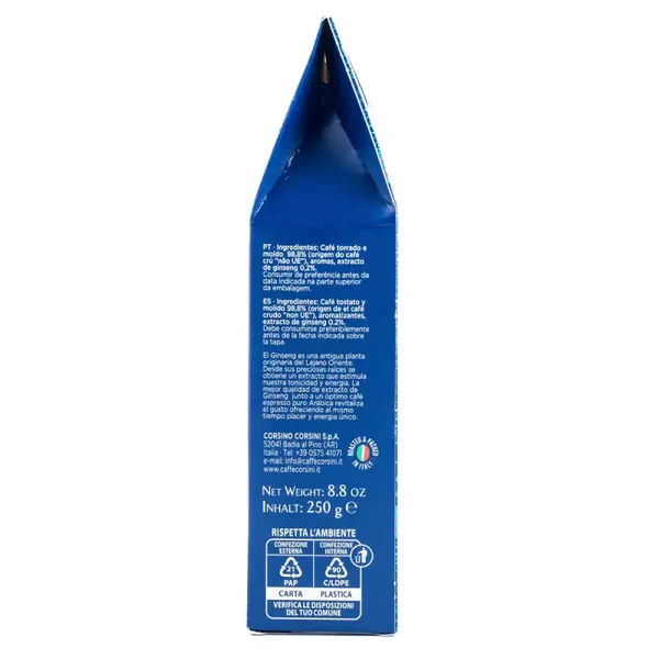 Savourez la douceur de l'Arabica associée à la force du ginseng. Café arabica pur torréfié et moulu combiné à un véritable extrait de ginseng. Café torréfié moulu 98,8 %, arômes, 0,2 % extrait de ginseng. Le mélange d'arabica pur a été conçu et torréfié spécifiquement pour améliorer les caractéristiques organoleptiques du produit final. Le ginseng a une teneur élevée en principes actifs revigorants. Café moulu pour Moka et emballé sous vide pour maintenir la qualité inchangée.
